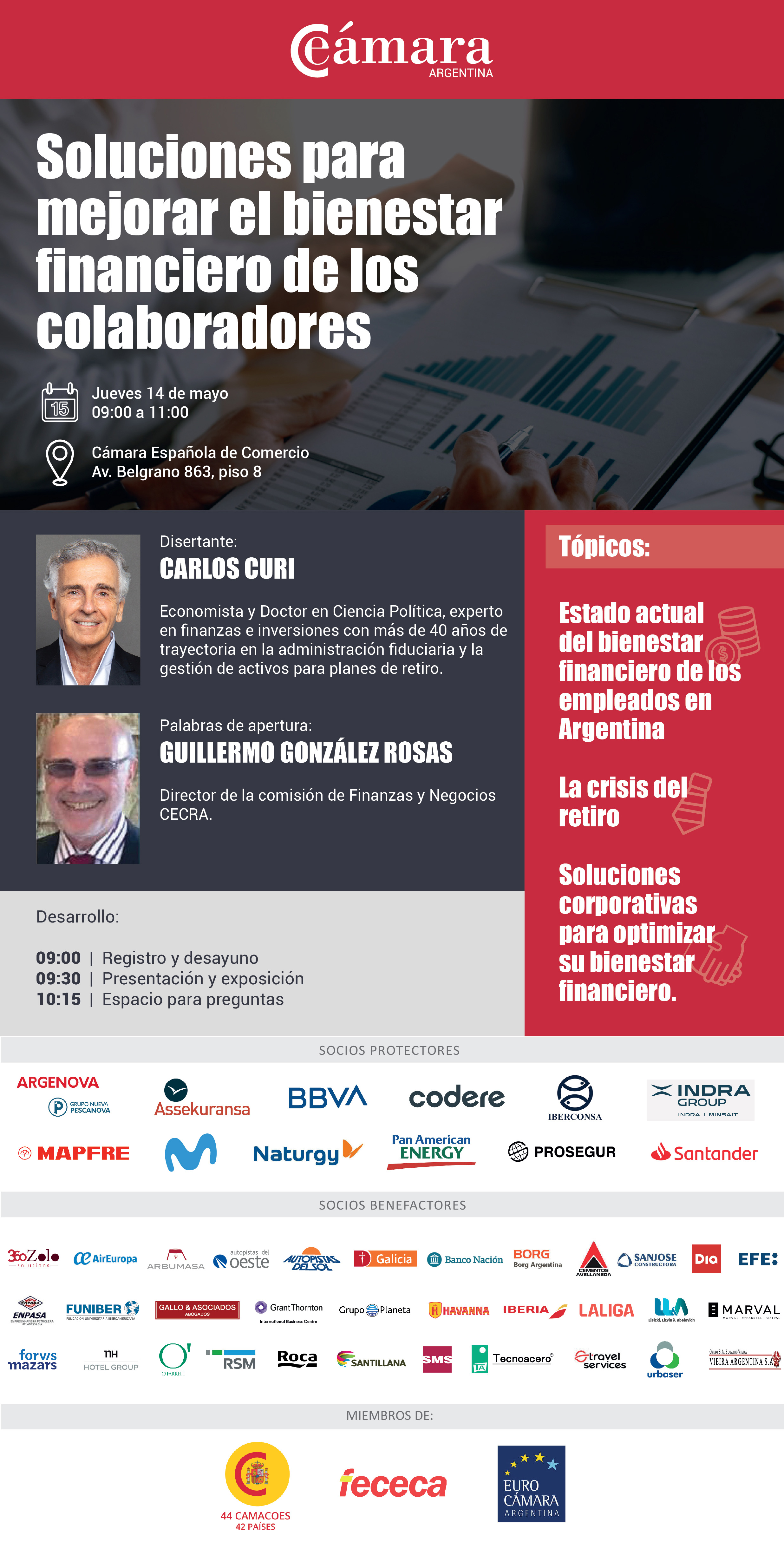 La Comisión de Finanzas y Negocios de la Cámara Española de Comercio te invita a participar de un Desayuno de Trabajo con el economista Carlos Curi, donde conversaremos sobre soluciones para mejorar el bienestar financiero de los colaboradores. Una excelente oportunidad para intercambiar ideas y llevarte herramientas prácticas aplicables a tu organización.